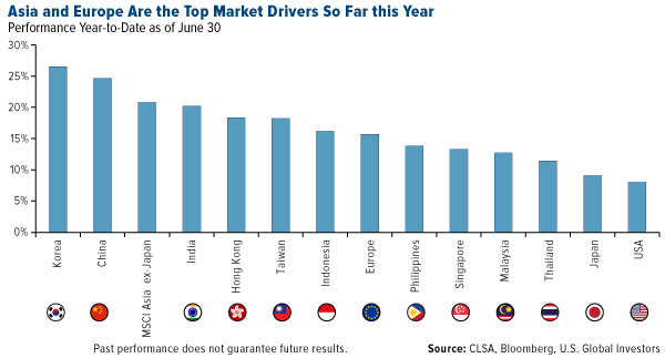 A new report from CLSA shows that Asian markets and Europe were the top performers during the first six months of the year. Korea took the top spot, surging more than 25 percent, followed closely by China.