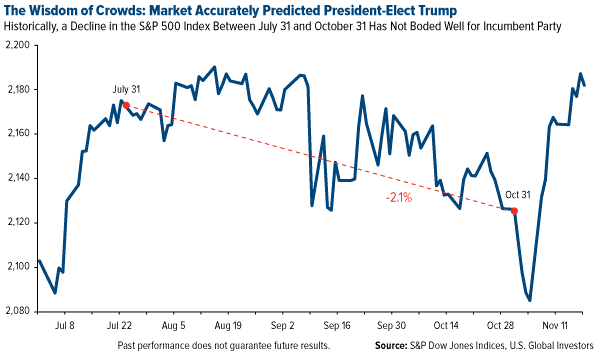 Consider the run-up to this year’s election. Nearly every poll pointed to Hillary Clinton taking the White House, with many pegging her chances at greater than 90 percent. The market took these prognosticators to task. Historically, when the S&P 500 has turned negative between July 31 and October 31, it’s spelled doom for the incumbent party candidate. This year, the market fell more than 2 percent, setting the stage for a Donald Trump victory.