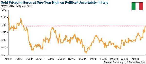 Gold is trading above $1,300 an ounce again, but there could be bigger upside the more investors realize the full and global implications of Italy’s political turmoil.