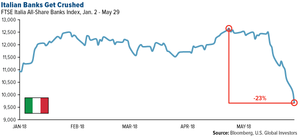 That said, the fear of another government debt crisis, similar to Greece’s, has naturally rattled markets. Because Italy, the eurozone’s third-largest economy, already has the highest debt-to-GDP in the bloc after Greece, and because Five-Star and the League both support ending austerity and challenging Brussels’ limits on government borrowing and spending, financials were the worst performing sector in the U.S. market, falling close to 4.5 percent for the week ended May 29. The Euro Stoxx Banks Index was down 5 percent for the same period. Italian banks fared even worse, collapsing nearly 25 percent since their high in late April.