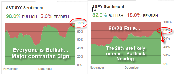 Below I have posted a two charts on sentiment courtesy of StockTwits to show these extreme readings of where the US stock market is trading at. The first chart is of the symbol $STUDY and this sentiment shows us that 98% of trading material is bullish on the stock market right now. My theory is, if everyone is moving in one direction, you better be ready for them to change direction any time. The masses move like a school of fish and one they get spooked they change direction and start selling everything they just bought.
