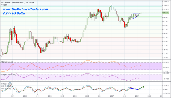 Currently, the US stock market has weathered a bit of a jolt in terms of price rotation. After many stock indexes reached new all-time highs, the news of Iran Oil Sanctions, US/China trade talks failing and the political turmoil in DC as an incredible 2020 US Presidential election cycle heats up, investors are watching the markets for any signs of strength or weakness. Meanwhile, the US Dollar continues to strengthen against other global currencies in an incredible show of “King Dollar” strength and dominance. All of this plays into one of our favorite narratives that we started discussing over 30 months ago – the Global Capital Shift.