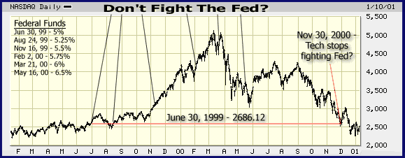Nevertheless, what this isolated look at Fed history can end up doing is building a framework of fallacy: the misguided belief that the markets have been following Greenspan to begin with. In fact, an objective look at market behavior does not portray investor harmony with the Fed. Take the simple notion of 'don't fight the Fed', a popular adage backing most non-recessionary premises today. Its premise is that as the Fed starts cutting interest rates one should not bet against stocks, and vise versa. But what this notion does not factor in is that the markets have been fighting the Fed tooth and nail since 1996. The most recent battle shows the Fed beginning to raise interest rates on June 30, 1999 – by the time Greenspan was finished raising interest rates the markets had just capped off their most fantastic rally ever.