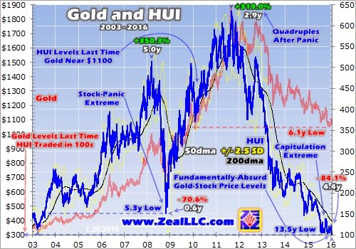 The ludicrous magnitude of this deviation is confirmed looking the other way, through the lens of gold. Just after the Fed finally ended its 7-year-old zero-interest-rate policy in mid-December, gold fell to a deep 6.1-year secular low. Where was the HUI the last time gold prices closed near $1050? Trading way up over 390, 3.7x higher. Gold-stock prices are so low that they need to quadruple merely to reflect gold today!