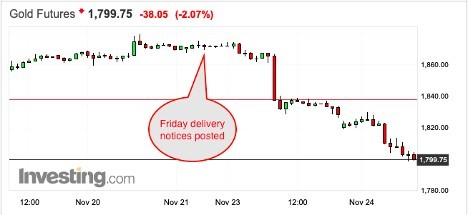 And so, why the sudden urge to smash price and force a liquidation event that coerces as many parties as possible to NOT stand for COMEX delivery next month? Actually it was just last week that we discussed the pending December delivery period in our weekly post. You should be sure to read it now if you missed it: Ahead of December COMEX Deliveries