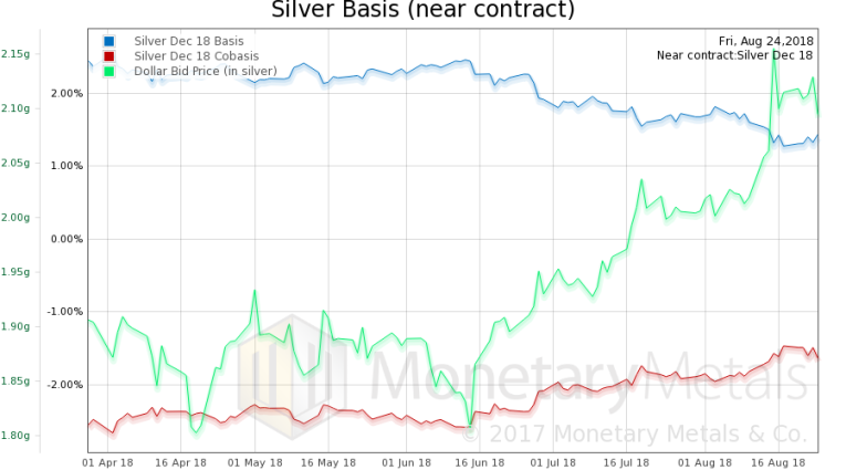 The picture in silver was a bit different. With the price not moving, we see the scarcity falling. The same occurs in the farther contracts, and the silver cobasis continuous.