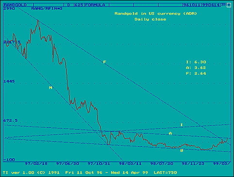 The daily chart of the dollar (ADR) price of Randgold clearly shows the recent break through line F – upper boundary of the major megaphone formation, M-F.