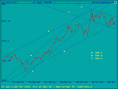 Vronsky, in his article of April 8, "Dow Utilities Lead Stocks", https://www.gold-eagle.com/gold digest 99/vronsky040799.html discussed the leader role played by the Dow Utilities Index. A chart of the Index showed that it was toying with support at the 200 day moving average. Here is a Chart Symmetry analysis of the Index showing that it has just repeated a break through 2-year support.