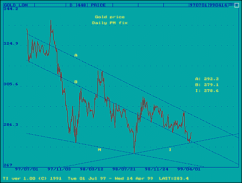 The chart shows the same bear channel used some weeks ago. Line I, with a gradient that is the direct inverse of that of line M, has been added. Note that the spacing of the bear channels is quite regular – a common feature of preferred gradients.