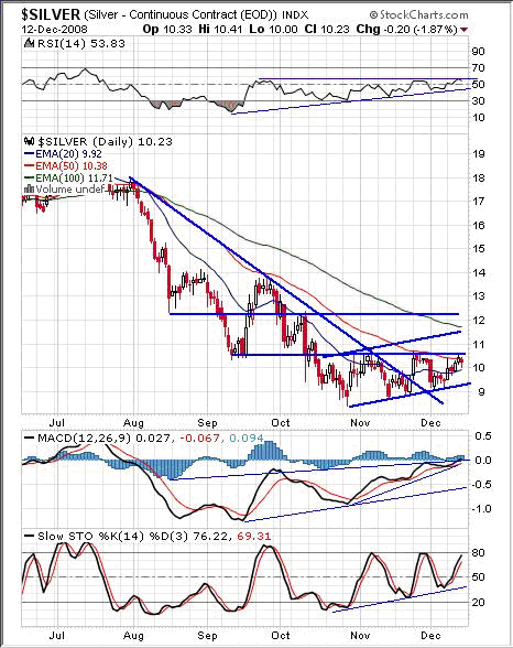 Silver clawed up 8.48% on the week. $10.50 is a wall of resistance. That reminds me. While out Christmas shopping recently I saw one of those robot vacuums which I have always been intrigued and curious about. I bought one and have been enthralled by it all week. It actually does a pretty good job if you block it in a room for a while. Anyhow looking at this chart reminded me of it. Silver keeps bouncing against this wall at $10.50 and just like our little robot helper senses the wall, retreats and runs along it occasionally bumping it to make sure it's still there until it finds that corner and continues on its path to freedom and cleanliness; and soon riches in silver.