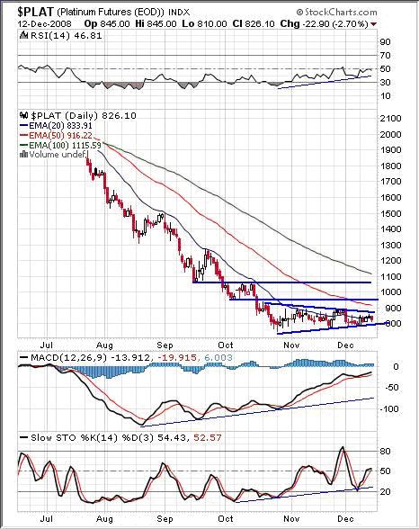 Palladium leaped 7.96% this past week from what looks like a double bottom formation. The downtrend from the November high is intact. The downtrend and bottom support line form a triangle which is very close to being resolved either on the upside or downside. I do not expect to see another lower low.