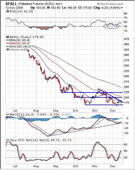 RSI also made a double bottom recently but still cannot get above 50. The moving averages are all lower but getting very close to the actual price now. Moving averages tend to be strong resistance lines so I think a range trade around here is what we will see before palladium can build enough energy to move above them. I am hearing reports of a tight futures market so who knows.