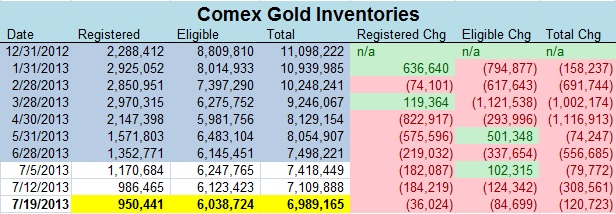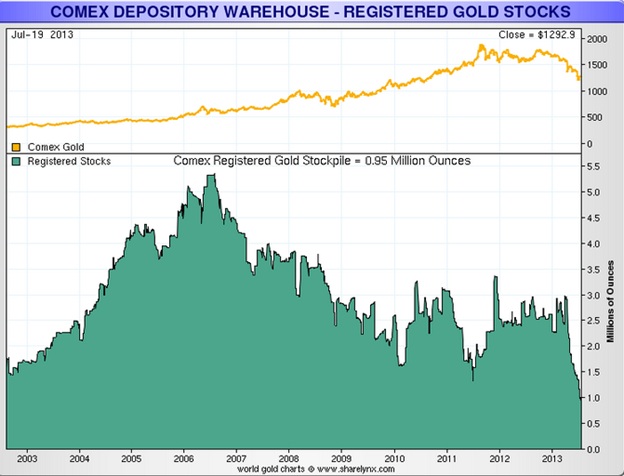 We have covered the rapidly declining COMEX gold inventories in previous articles, and the story seems to be getting old, but COMEX gold continues to drop with registered gold inventories hit their lowest levels ever. Additionally, total COMEX gold has now dropped under 7 million total ounces or by almost 40% since the beginning of the year (we started 2013 with around 11 million total ounces).