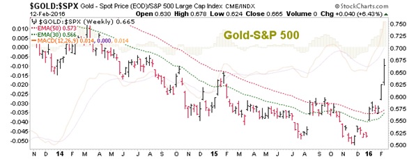 - Gold Rises vs. Currencies: This one has been in process. I have marveled at how desperately millions of market participants have clung to their confidence in monetary authorities who routinely tramp out paper and digital money units. That is now cracking and recently we have introduced a new indicator, risk ‘off’ metal (gold) vs. risk ‘off’ currency (Swiss Franc) and gold has broken out vs. Swissy, indicating a waning confidence in paper/digital money.