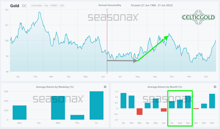In total, gold could still run sideways or correct further in the coming four to about six weeks. According to the seasonal pattern, however, from the beginning or mid of August one should then be fully positioned again.