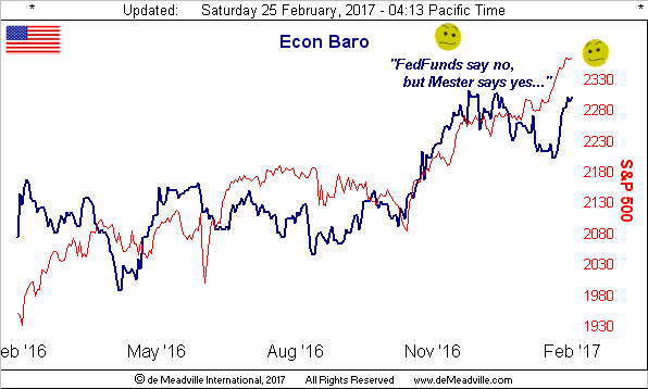 Above we earlier displayed the comparable percentage track of the Fed Funds rate vis-à-vis Gold, et alia. The rate itself settled out the week at 0.70% on the March contract. That is within the Federal Open Market Committee's present target range of 0.50%-0.75%. Not far beyond that range is the June contract's settle at 0.86%, which if the FOMC were to vote for a rate hike would be in their then 0.75%-1.00% range; but the conviction for a hike seems lacking in the trade. On the other side of the coin, non-FOMC member Dr. Loretta Mester (Cleveland FedHead) said this past week she'd be "comfortable" with a rate hike given the pick up in recent inflation data. Add to that gains in Home Sales and an upward revision in the University of Michigan's Index of Consumer Sentiment, and "Jump back, Loretta, the Baro's waitin' for ya":