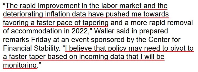 For context, the FOMC announced the taper only 20 days ago. And now, Clarida is hinting at accelerating the Fed’s already accelerated taper timeline. Furthermore, Fed Governor Christopher Waller (another voting FOMC member) said on Nov. 19 that two outcomes are possible over the coming months: