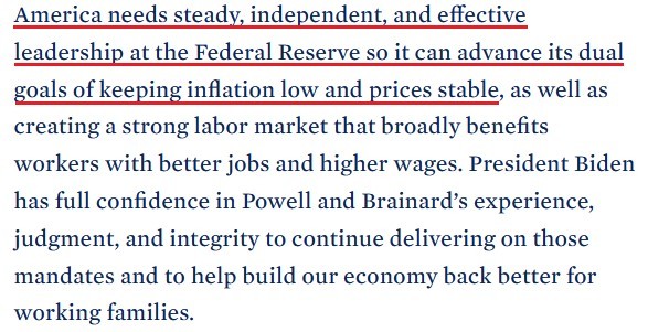 And U.S. President Joe Biden added on Nov. 22 that he’s “confident that Chair Powell and Dr. Brainard’s focus on keeping inflation low, prices stable, and delivering full employment will make our economy stronger than ever before.”