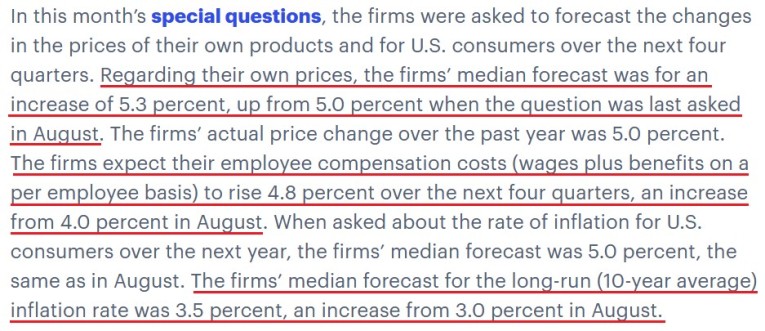“Firms continued to report increases in prices for inputs and their own goods. The prices paid diffusion index rose 10 points to 80.0, its highest reading since June’s 42-year high of 80.7. Over 82 percent of the firms reported increases in input prices, while 2 percent reported decreases. The current prices received index increased 12 points to 62.9, its highest reading since June 1974.”