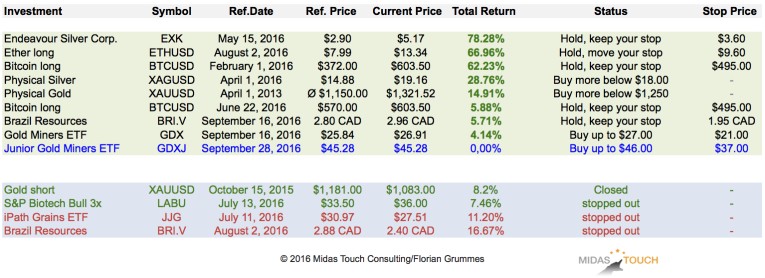 As recommended in my last report we were able to buy GDX and BRI below the defined limits. Besides that the portfolio is doing well and all positions are currently in green...