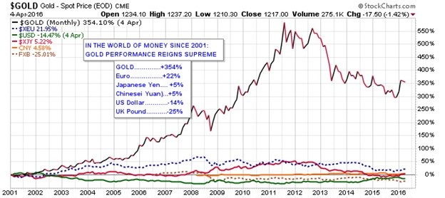 All monetary students and currency pundits must necessarily agree that GOLD HAS BEEN MONEY for over 5000 years. Moreover, GOLD’s attributes and universal acceptance eminently qualifies it as the most valuable currency on earth. Proof of this statement is the following picture worth 1000 words. It is the chart of the performances of the world’s major currencies: GOLD, Euro, Japanese Yen, Chinese Renminbi (yuan), US Dollar and the UK’s Pound Sterling.