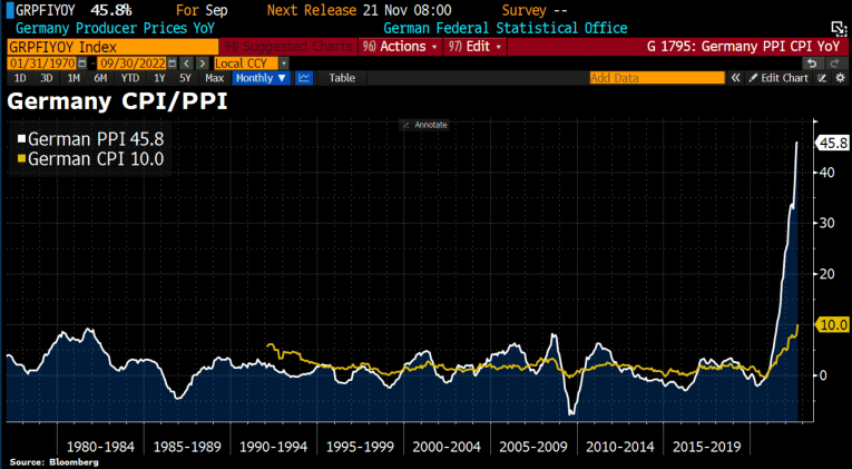 Consumer prices vs. producer prices in Germany as of September 30th, 2022. Source: Holger Zschaepitz