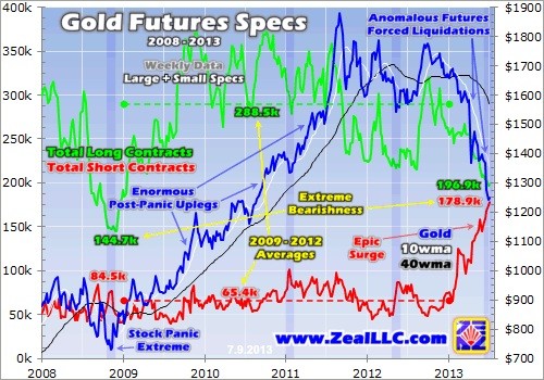 After plummeting so rapidly in 2013, largely driven by the high gold-futures leverage biting the longs, gold is hyper-oversold and due for a massive rebound rally. If that happens fast enough, the shorts will be forced to buy to cover rapidly and trigger a short squeeze. The US futures markets have a long history of every contract being honored, there are no defaults. So the vast gold shorts can only be closed by offsetting buying.