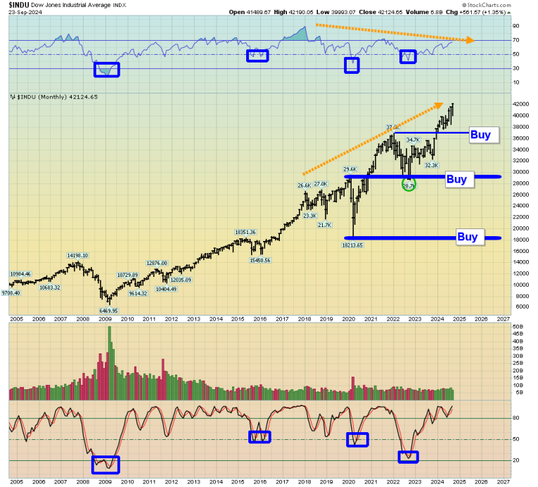 What is clear is that the stock market is nowhere near a buy zone of significance; RSI and Stochastics on this monthly chart should both be down to the 50 area (or lower) before the market can be said to offer value for investors.
