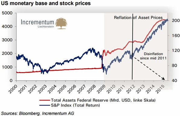 While from 2008 to 2011 the prices of both stocks and commodities (and thus the prices of real assets) were driven higher, a disinflationary trend in commodity prices can be discerned since 2011. Since then, money supply inflation primarily induced financial asset price inflation. This phase has culminated in a disinflationary tsunami in 2014. A strengthening US dollar exerting deflationary effects once again delayed the probability of a rate hike and left the much-desired zero interest rate environment in place, benefiting stock markets.