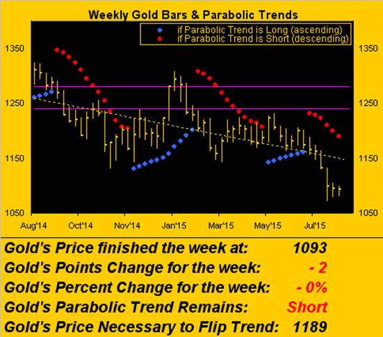 Next week is back-loaded with some 11 economic reports alone over Thursday and Friday to weave into the Econ Baro, which as we saw above of its own accord is weaving this way and that. We'll no doubt work it all into next week's 300th consecutive Saturday edition of The Gold Update. So avoid becoming paranoid, stay the Golden Course, (keep an eye on those "Baby Blues"), and see you then!