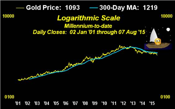And from the "Hope and Patience Dept." in charting Gold logarithmically day-by-day from the turn of the millennium-to-date, the 48% pullback since 2011 appears as but the downside of a gentle swell as price navigates the financial seas toward a more northerly port: