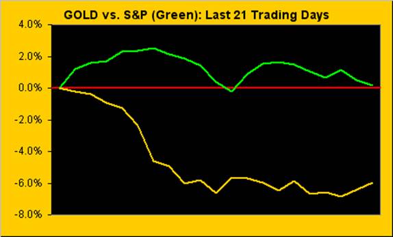 As for the stock market, 'twas merely one month ago that Gold was dancing a perfectly entwined pas de deux with the S&P 500. They since having parted ways has changed the act into a pas de gone. And oh the concern of the stock market's having put in a series of days that were down! Methinx "they've" lost all conception of what "down" is. Watch in the offing for a pas de croix: