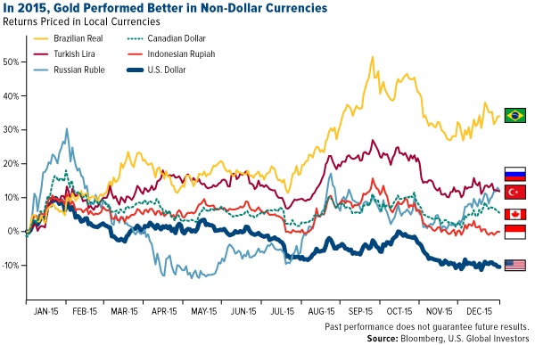 Note the differences in returns between gold priced in U.S. dollars and gold priced in the Brazilian real, Turkish lira, Canadian dollar, Russian ruble and Indonesian rupiah.