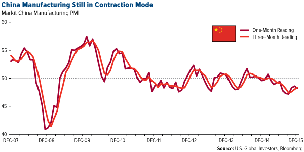 Aside from real interest rates, gold prices are being challenged by weak manufacturing data around the world. China’s purchasing managers’ index (PMI) fell to 48.2 last month, down 0.4 points from the November reading. The Asian giant’s manufacturing sector spent a majority of 2015 in contraction mode, managing to rise above the key 50.0 level only once last year, in February.