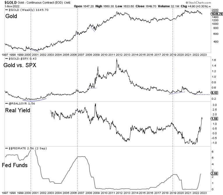 Bottoms in the gold market tend to coincide with peaks in real yields which usually peak around the time of the Fed’s final interest rate hike. Gold also bottomed in 1999 and 2016 when the Fed started raising interest rates, but that is not relevant to the present.