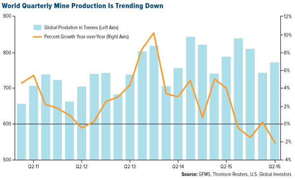 This year, second-quarter mine supply was 2 percent less than the same period in 2015, according to preliminary estimates made by Thomson Reuters GFMS. Some analysts now expect global production to fall 3 percent in 2016, after seven straight years of growth.