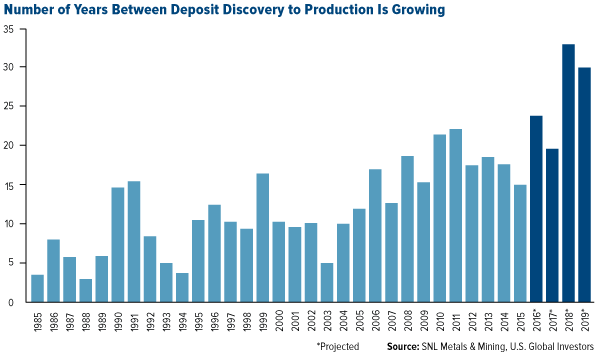 Indeed, if we look at projects that opened in just the last two or three years, we see that they’re of lower grade, meaning they don’t produce nearly as much as older, easy-to-mine gold deposits.