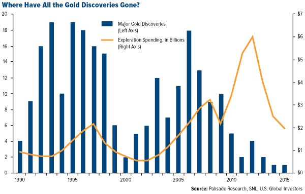 What all of this means is we’ll probably continue to see fewer and fewer major discoveries, or those that yield more than a million ounces. As you can see below, new gold discoveries peaked in 1995. Exploration spending peaked nearly 20 years later when the price per ounce averaged $1,600.