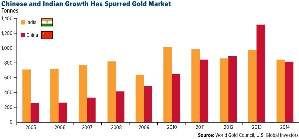 This might all change as more and more Chinese citizens move up the socioeconomic ladder. Over the next five years, the country’s middle class is projected to swell from 300 million to 500 million—nearly 200 million more people than the entire population of the United States. This should help boost gold bullion and jewelry sales in China, which fell 33 percent from the previous year.