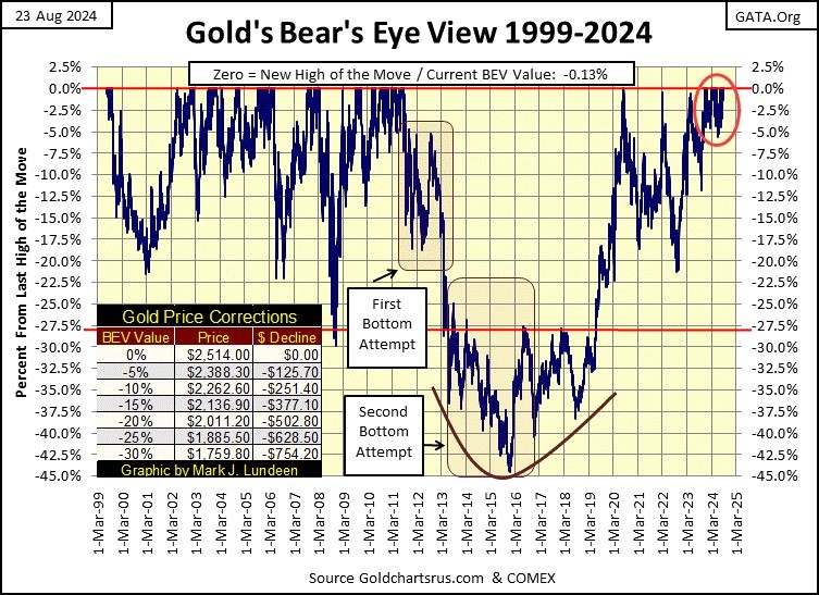 So, lets now go on to gold’s BEV chart below. This BEV chart covers the gold bull market since it began in February 2002, when gold bottomed at $253 an ounce. You may wonder, why was gold selling for $253 an ounce?