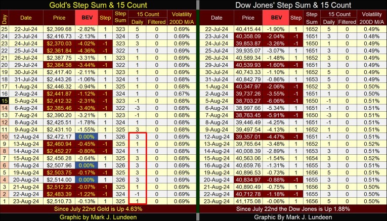 The Dow Jones is also looking good in its step sum table. No new BEV Zeros since July 22nd, but I expect we’ll see that corrected sometime next week. Considering the Dow Jones has to advance only $24 from Friday’s close, its hard imaging it won’t. The Dow Jones 15-count closed the week at a +5, still neutral, but it’s getting up there. The Dow Jones daily volatility’s 200D M/A continues to be low, far from the critical 1.00% level, and that is a big positive for the stock market.