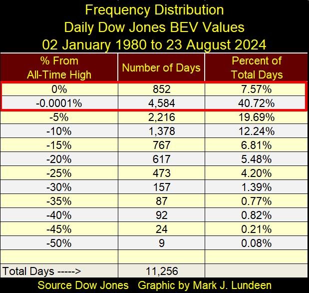 This week I’m using a Dow Jones BEV chart going back to 1980, to point out how many new all-time highs (0.00% = BEV Zero) the Dow Jones has seen these past forty-four years. Below the BEV chart, I have a frequency table, compiling the daily BEV values seen in the chart below. Since January 1980, the Dow Jones has seen 852 daily new all-time highs. Each of these BEV Zeros occurred only when the Dow Jones was in scoring position (BEV values -0.01% to -4.99%), which the Dow Jones closed in for 4,584 NYSE trading sessions since January 1980.