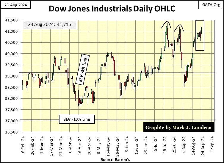 The day is soon coming when the XAU will make a new BEV Zero in its BEV chart below. Can that be a good omen for the Dow Jones?