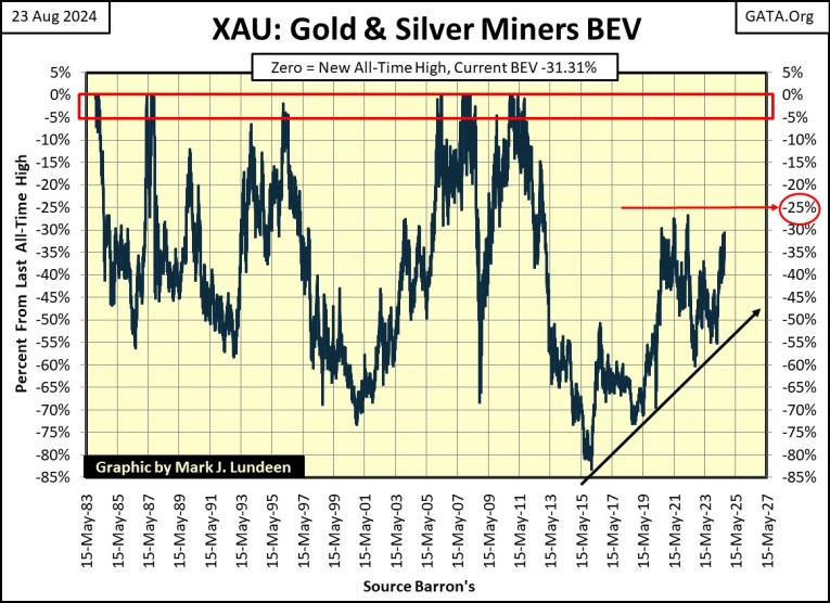 Now compare the XAU’s BEV chart below, with the Dow Jones’ BEV chart above. Since 1983, since its creation, the XAU had seldom closed in scoring position, or made new all-time highs. The XAU is typically countercyclical to the Dow Jones; bad times for one is usually good times for the other, and that is exactly what we see when we compare the past four decades with these two BEV charts.