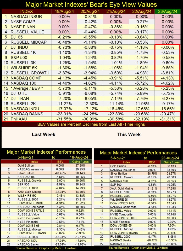 This week in my table listing the BEV values for the major market indexes I follow, once again we see some new all-time highs. At Friday’s close, six of these indexes closed at a new all-time high, the next eight closed in scoring position. For the bulls, this was a good week. Obviously, “liquidity” from somewhere, I couldn’t say where, is flowing into the stock market.
