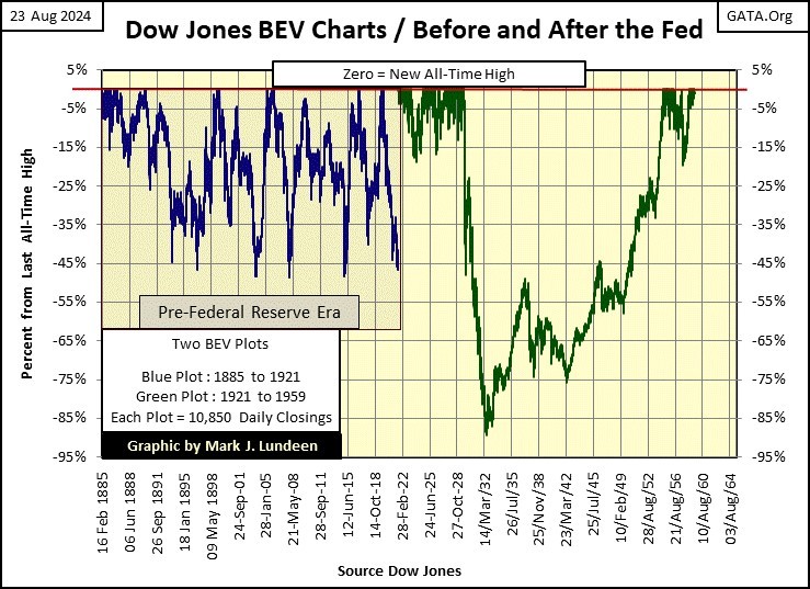 The impact this legislation had on the Dow Jones (the stock market) can be seen below, in the blue BEV plot from 1885 to 1921. Wall Street was a wild place before its valuations were “stabilized” by the idiots.