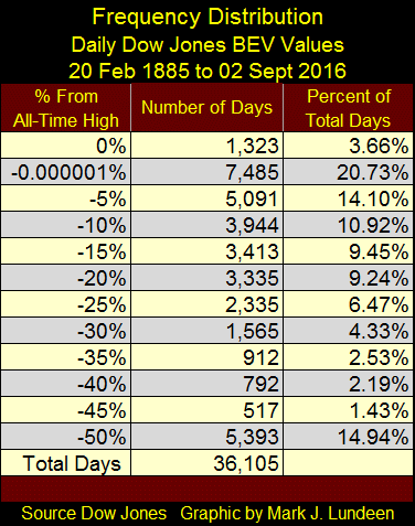 Next the frequency distribution table for the Dow Jones BEV plot seen above, from 20 February 1885 to 02 September 2016. The data is daily, and since February 1885, the Dow Jones made 1,323 daily new all-time highs. The -0.00001% row catches the daily closes that are just a penny away from being a new all-time high, down to -4.99% from being one. This row is necessary to isolate actual all-time highs in the 0% row. The Dow Jones since 1885 has seen 7,485 daily closings not far from being a new all-time high.