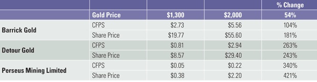Figure 3 shows estimates of cash flow per share (CFPS) for different sized Gold miners under Gold prices at both $1,300 and a $2,000 per ounce. As you will note, the potential returns vary from 180% for the lumbering seniors to 420% for some of the smaller producers.