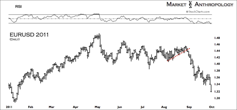 Following up on our thoughts in last weeks note (see Here), we wanted to point out the breakdown similarities that we have been following in the dollar - compared to the EUR/USD breakdown during the late summer market decline in 2011. Although the top has been much broader than we expected last year, not surprisingly, it is the inverse relationship today that is coming under pressure, as the euro has been a major funding currency in the markets over the past few years.