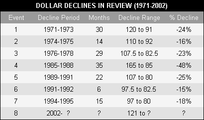 A review of the dollar declines from 1971-2002 reveals that indeed the US Dollar Index is most likely targeting the 80-85 level. The table below shows statistics related to seven major dollar declines in the past 32 years.
